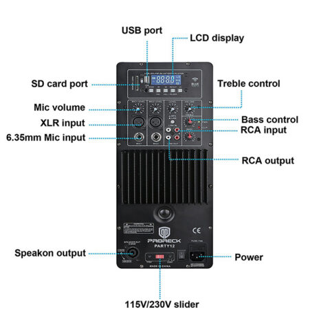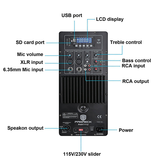 - XLR and 1/4” Mic Inputs for balanced and unbalanced microphones; RCA Line Input and RCA Line Output; Speakon output; 115 V/230 V power selector