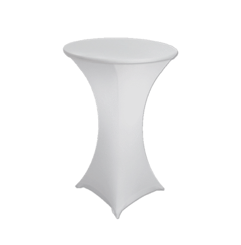 Dress up your party, trade show, or wedding with this spandex white tablecloth rental linen available in almost any color (upon request). This linen is meant to be used with our highboy tables that have a 4 prong “star” base, as pictured.