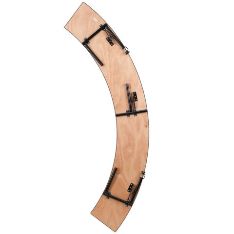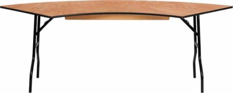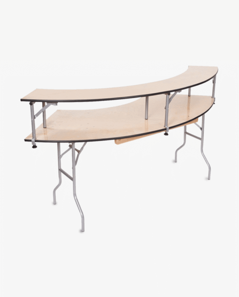 This semi-circular wood folding table allows you to create a serpentine bar riser set, half circle or full circle table. The serpentine table allows you to create beautiful arrangements for weddings, banquets and other events. Create a serpentine table by placing two tables in alternate directions.