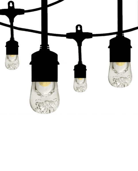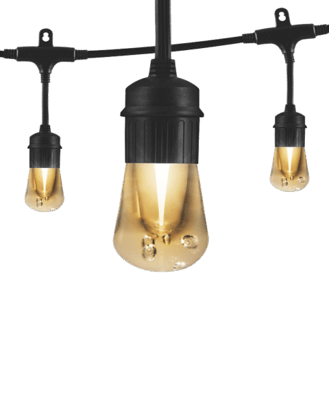 - Each strand of the cafe string lights rental Atlanta has end-to-end connections, so you can link multiple sets to achieve the perfect length for any installation. The grounded power cord plugs into any standard outlet, and features an 18″ lead-in from the plug to the first bulb, with a 6″ lead-out from the last bulb to the female mating receptacle to ensure consistent spacing across multiple strands.