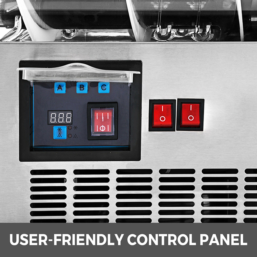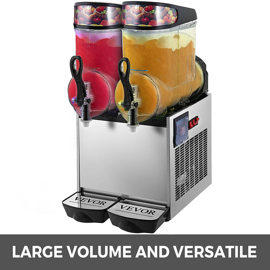 Dispense various beverages such as granita drinks, frozen cocktails, fruit juices, smoothies, coffees, cappuccino, and tea slush beverages. The volume of this slush machine is 12L per tank. Very suitable for commercial use.